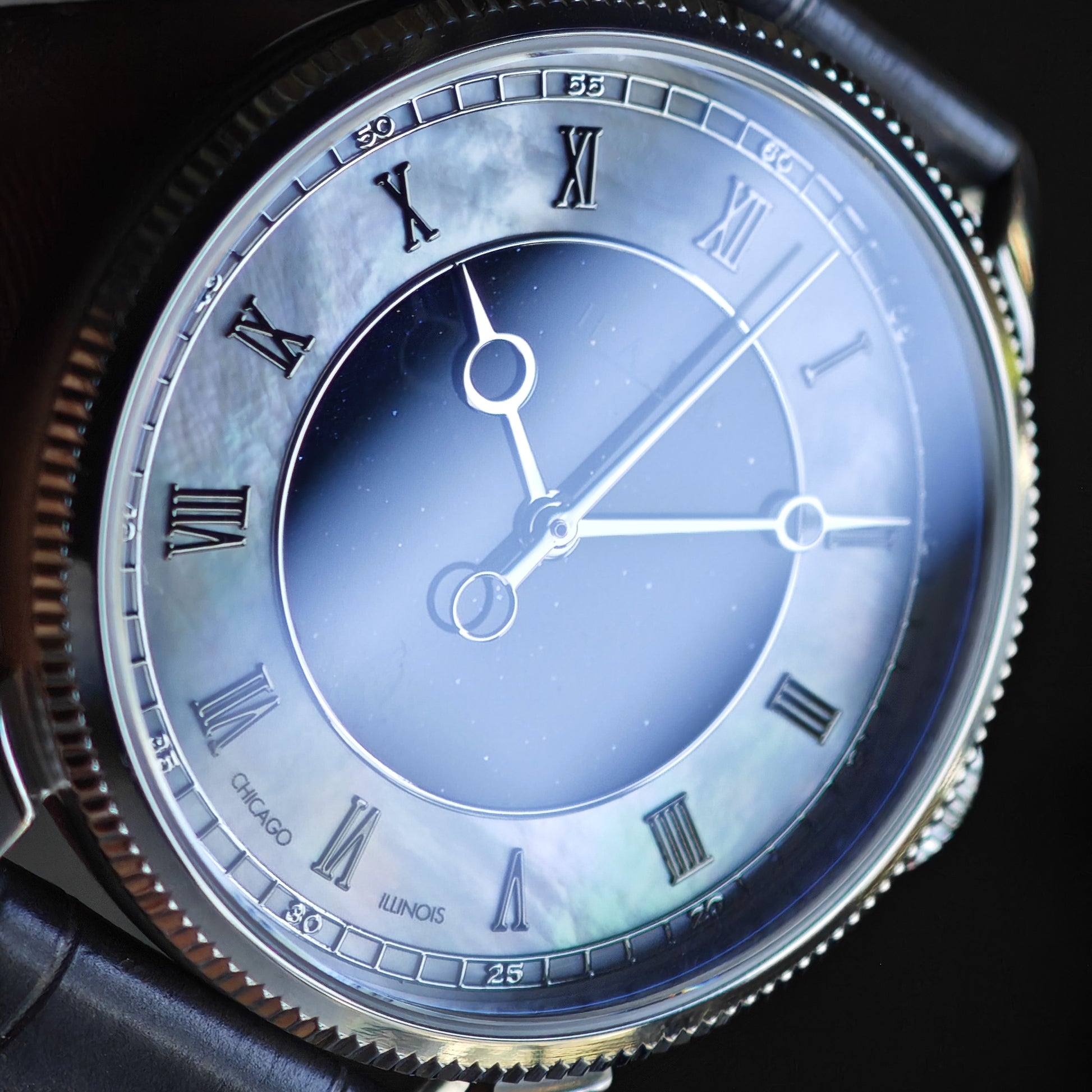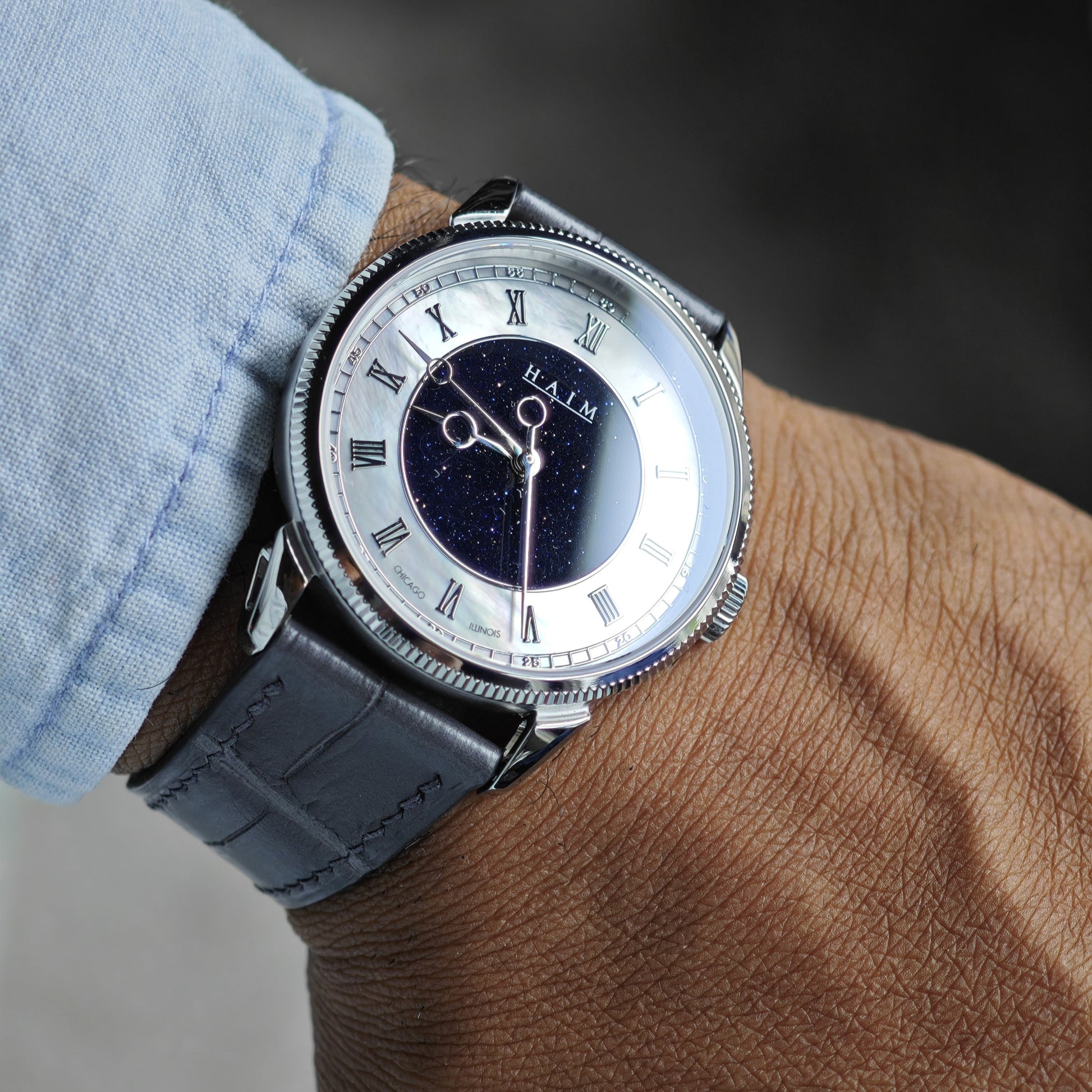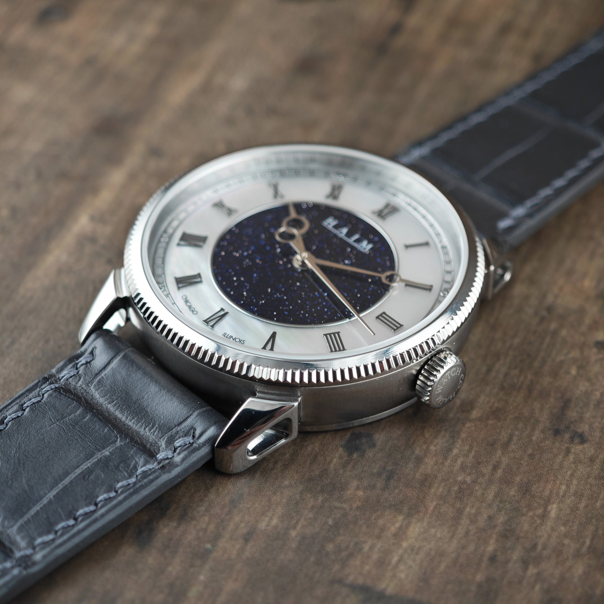 caliber and is also 100% US assembled, including the movement. Starry Pearl features a new Aventurine dial with an outer Mother of Pearl ring, completed with applied pewter colored Roman numerals, redesigned hands and an applied railroad seconds track! It’s cased in hand-finished, titanium with a subtle coin edge bezel, hollowed lugs and an exhibition caseback. The Legacy Automatic: Starry Pearl is paired with a curated “Stone Grey” crocodile strap, from Delugs.